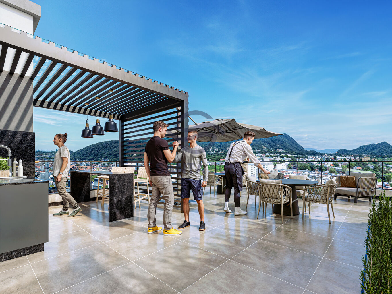 No topo do edifício, um rooftop espetacular aguarda por você.
